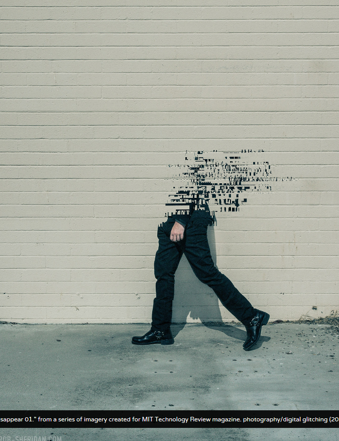 Instead of using hexed files or photmoshing as a from of ‘cracking’ or ‘breaking’ a file and then contending with those results, he uses Photoshop and other editing software to crate fake glitches that carry the aesthetic of Glitch Art. This gives Sheridan more control over his work and how ‘glitches’ effect the original material. His work is therefore a mimic of a glitch but also pleasing to the eye as opposed to somewhat disjointed which is a trait of other artworks which use genuine glitches.