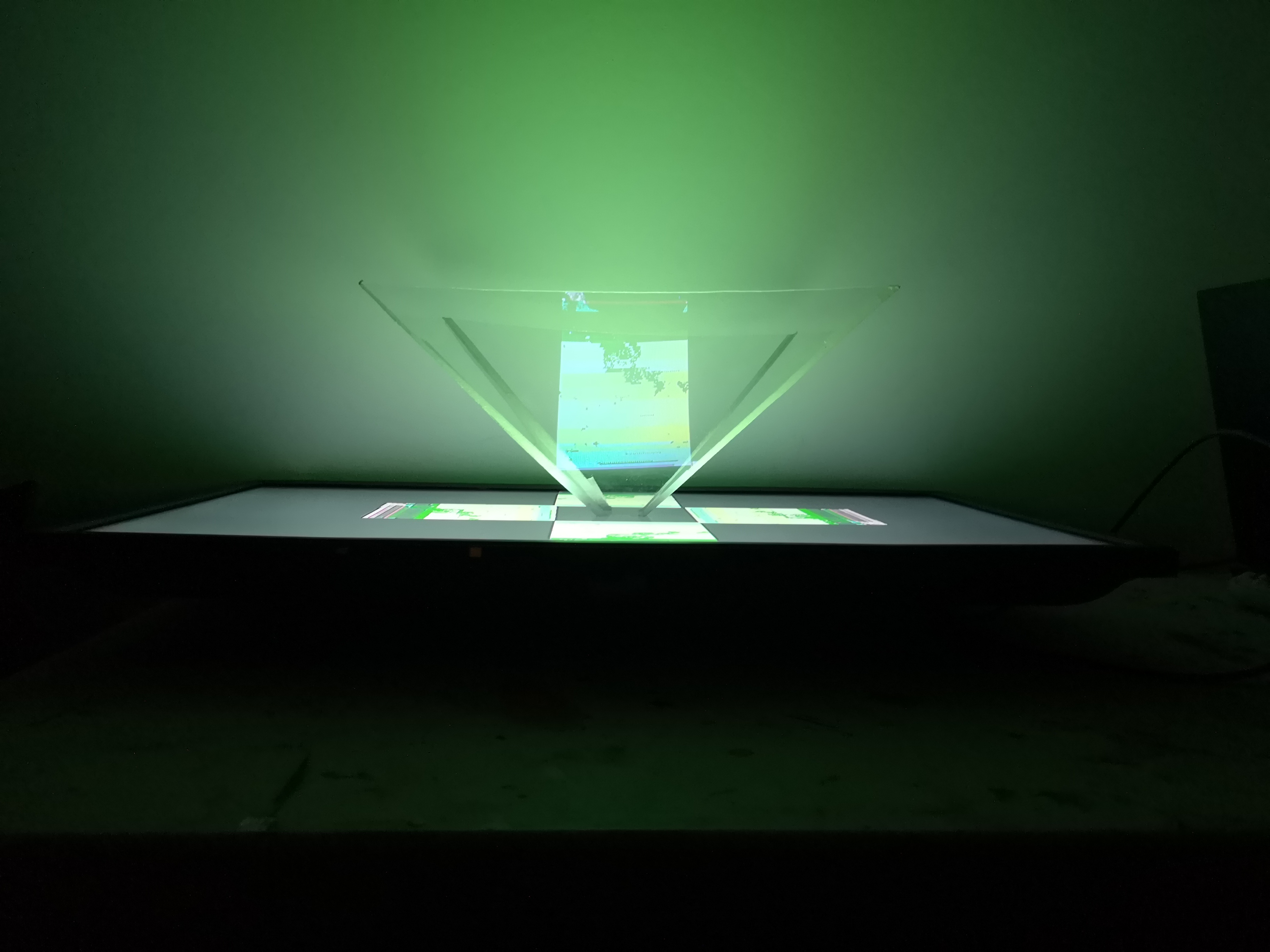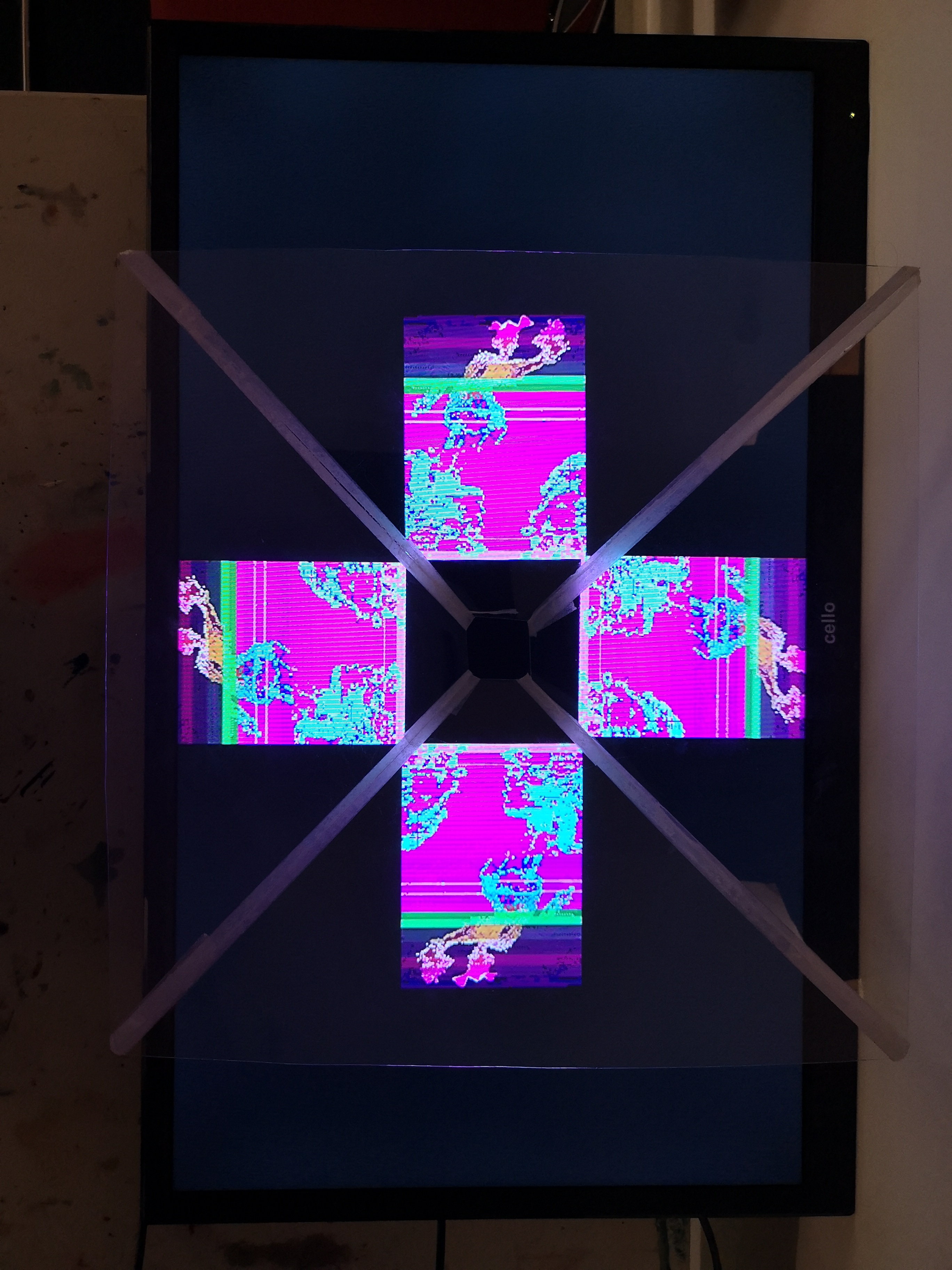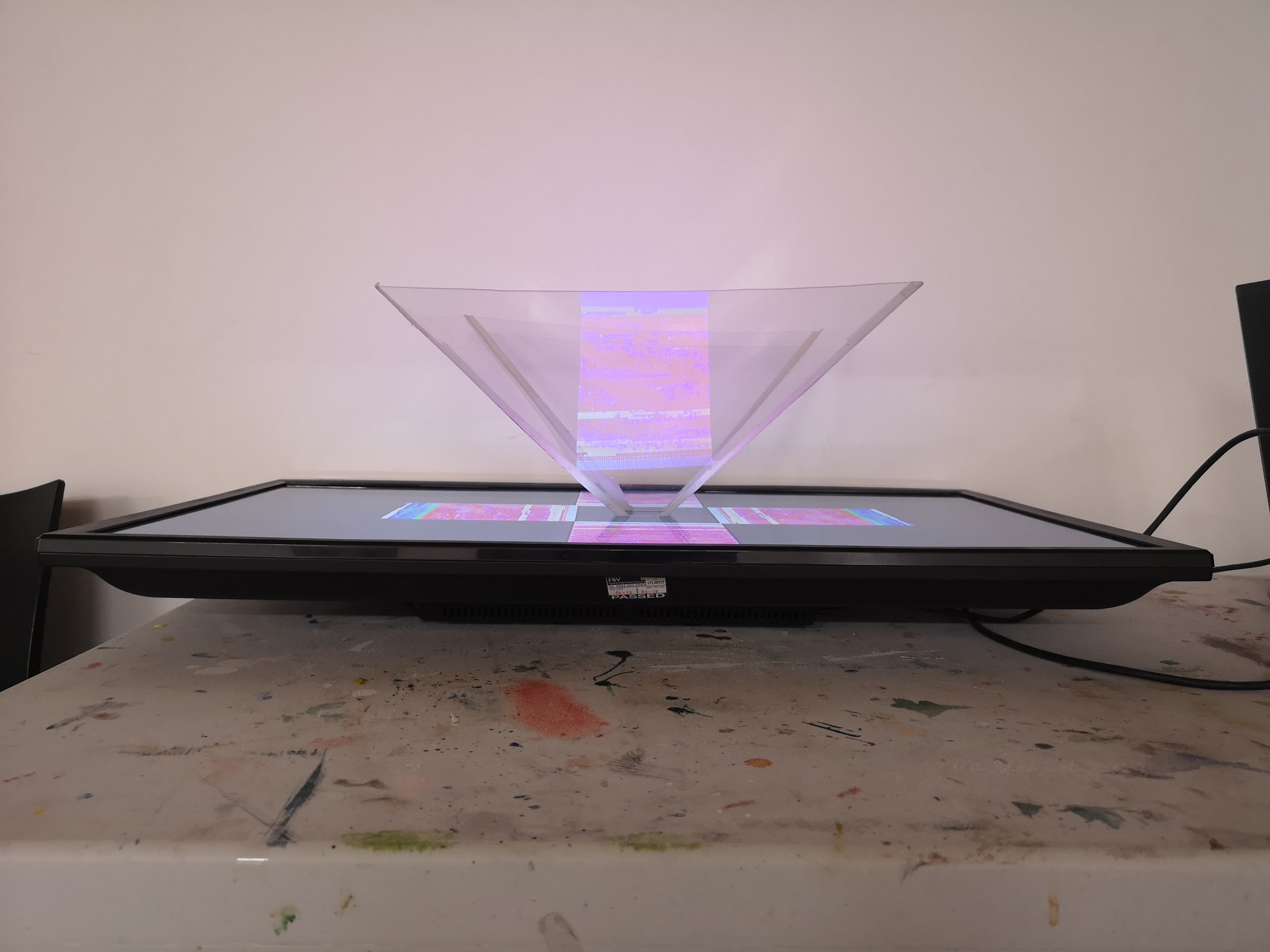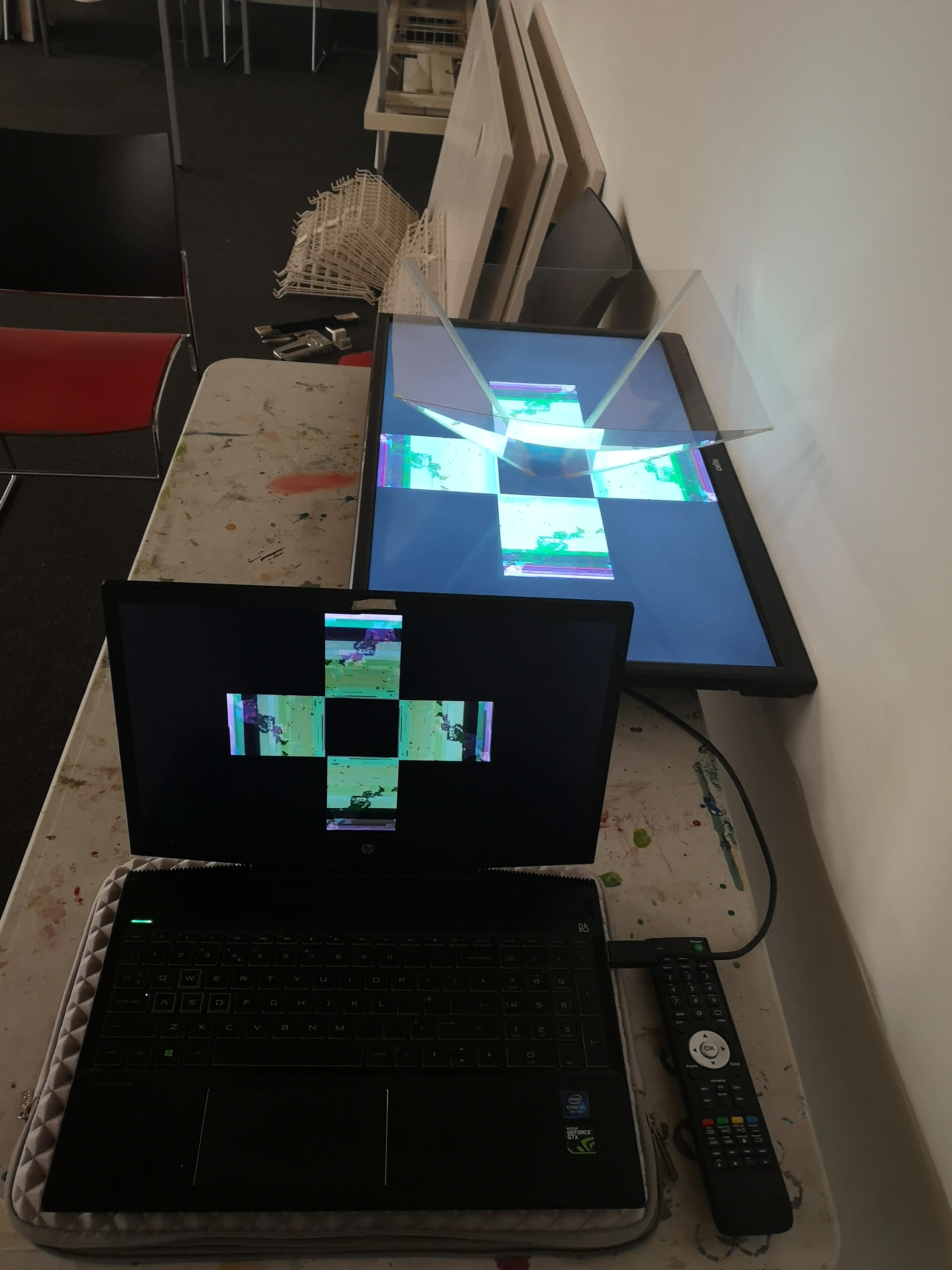 The second Projection Pyramid I’ve built has been scaled up to x2 the dimensions to make it larger. I displayed it on a 32” screen this time resulting in a much larger 3D image and a more impressive effect. Displaying it in C15 came with some challenges as although dark, it was not dark enough for the full effect of the hologram. I should probably look at setting it up in the Boweland dark space as there is almost no light in there. Otherwise the test was successful and in order to capture a larger image I think I’ll make another pyramid that is larger and fits the 32” screen better.