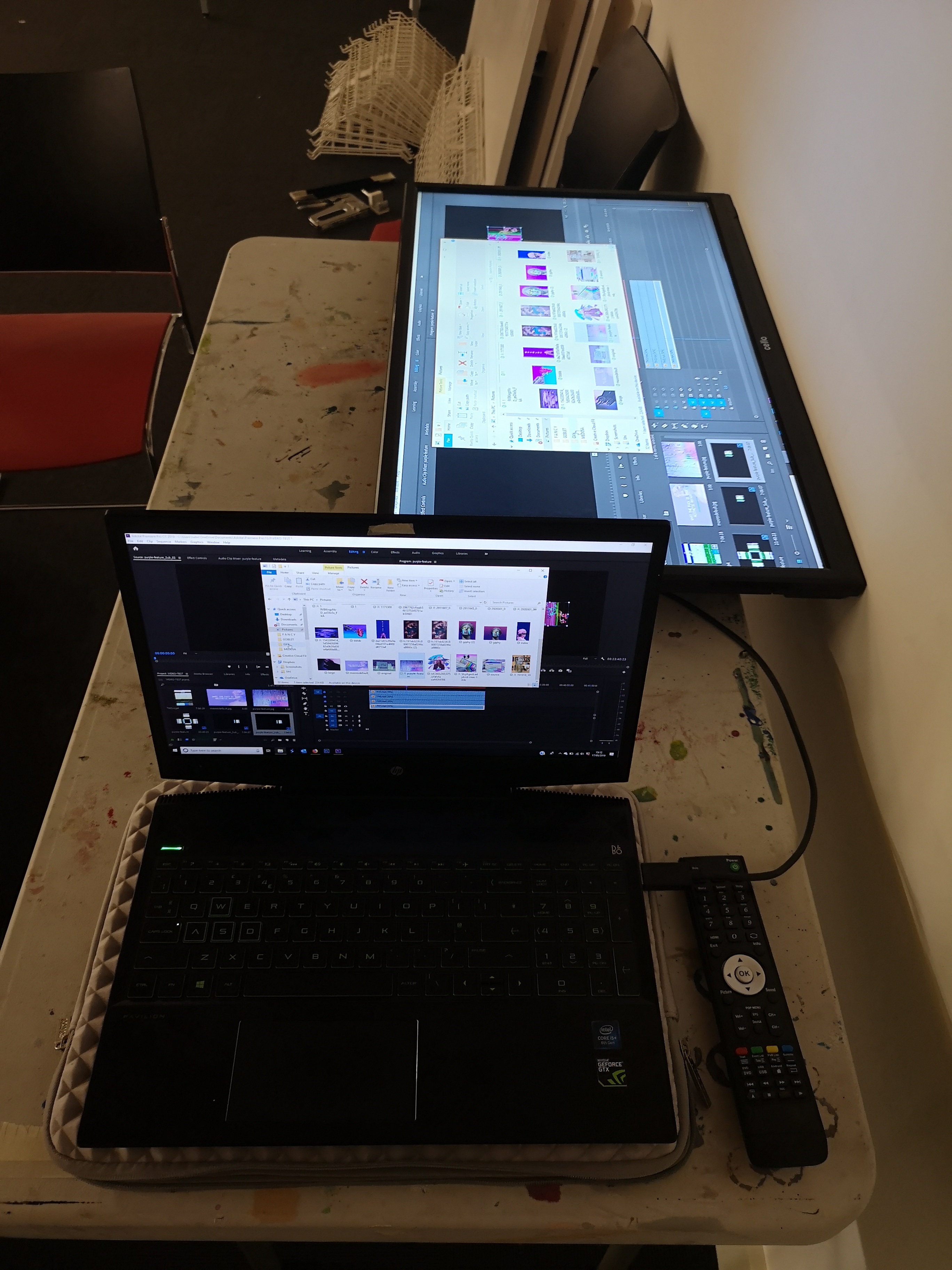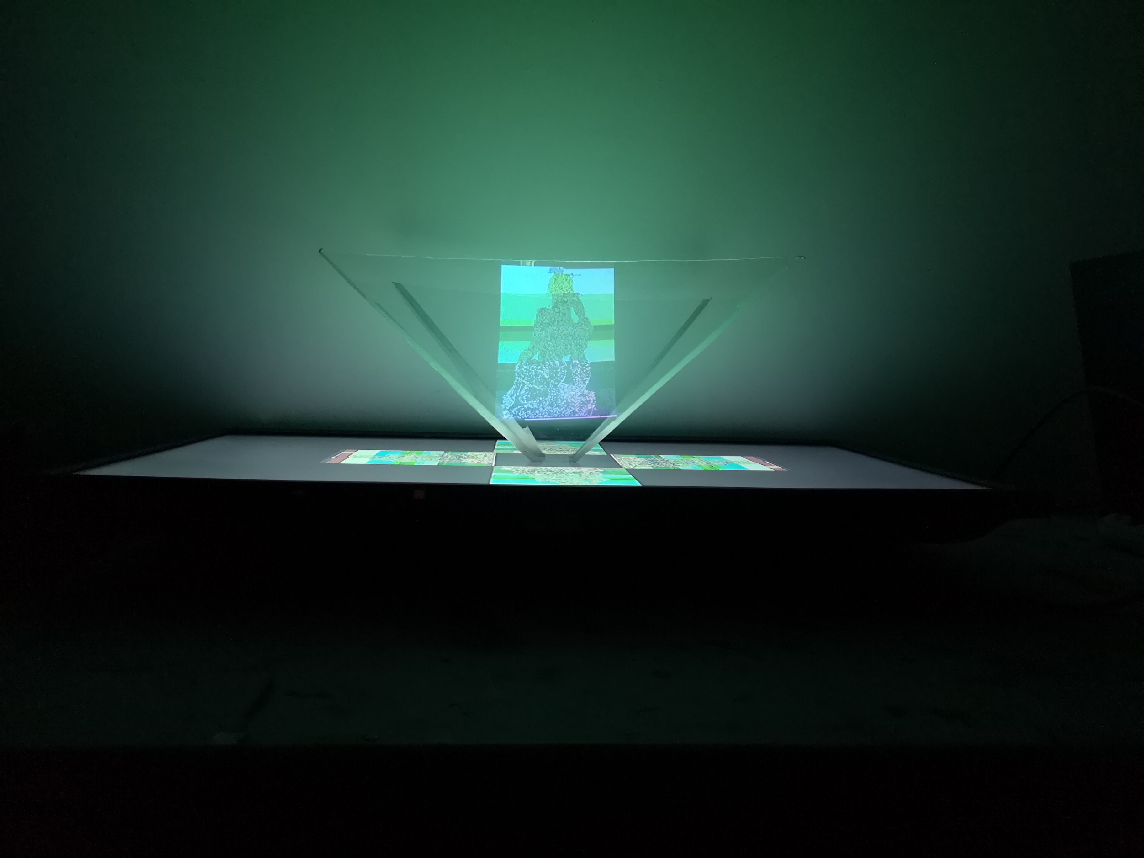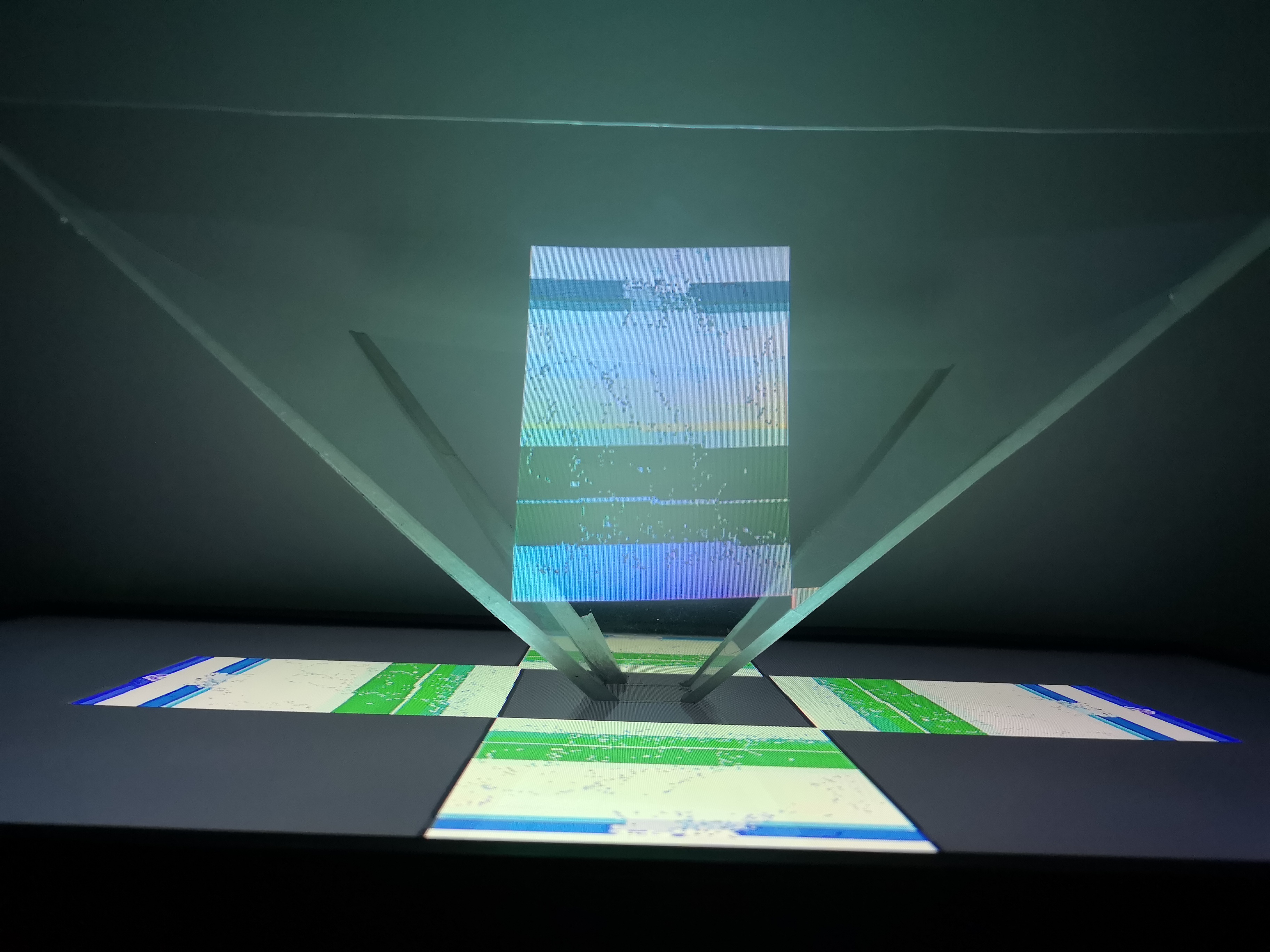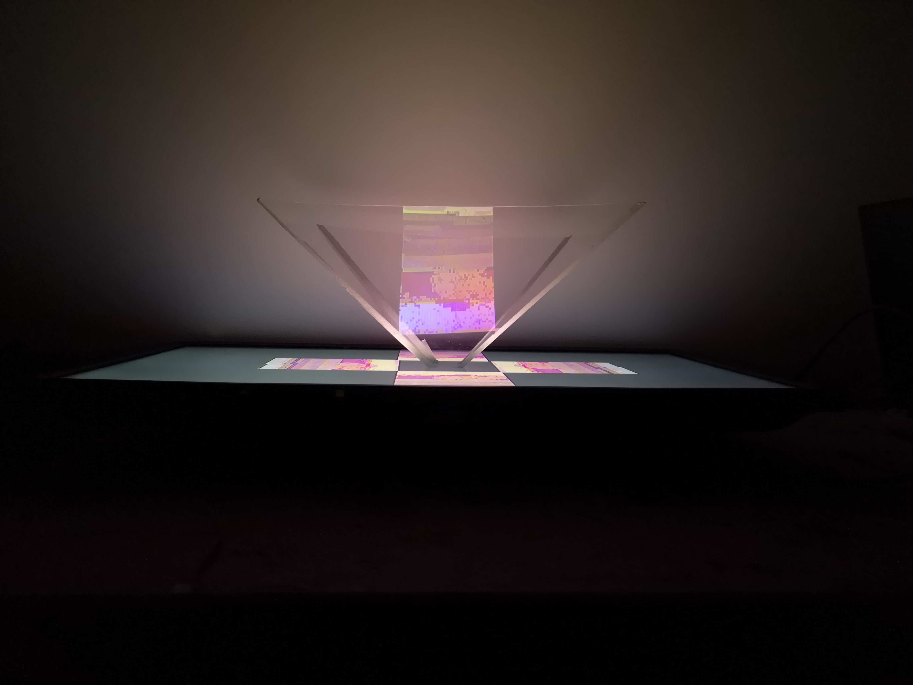 The second Projection Pyramid I’ve built has been scaled up to x2 the dimensions to make it larger. I displayed it on a 32” screen this time resulting in a much larger 3D image and a more impressive effect. Displaying it in C15 came with some challenges as although dark, it was not dark enough for the full effect of the hologram. I should probably look at setting it up in the Boweland dark space as there is almost no light in there. Otherwise the test was successful and in order to capture a larger image I think I’ll make another pyramid that is larger and fits the 32” screen better.