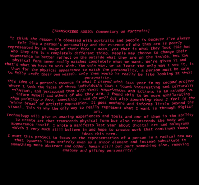 I want this project to focus on the representation of a person in a radical new way that ignores faces entirely even as a minor element and instead substitute in something more abstract and odder, human still but part something else, removing anatomy and gifting personality.”