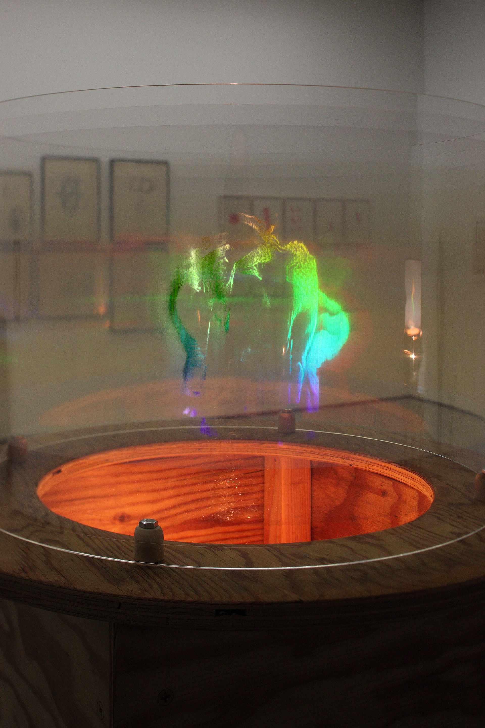 Although all the holograms here are lit from below with an even incandescent light, another version of one of them, Striding Crawling, 1975–78, is illuminated by candlelight when it’s displayed. One can imagine what a flickering, inconstant light would add to Forti’s movements, which track the transition from crawling to standing and can sometimes stretch and condense at the invisible edges of the holographic film. She was not the first nor the last artist to use holograms (Bruce Nauman’s “Making Faces” from 1968 comes to mind), but she was uniquely qualified to consider its capacity to register movement, creating a dynamic sculptural-photographic hybrid out of a live form.