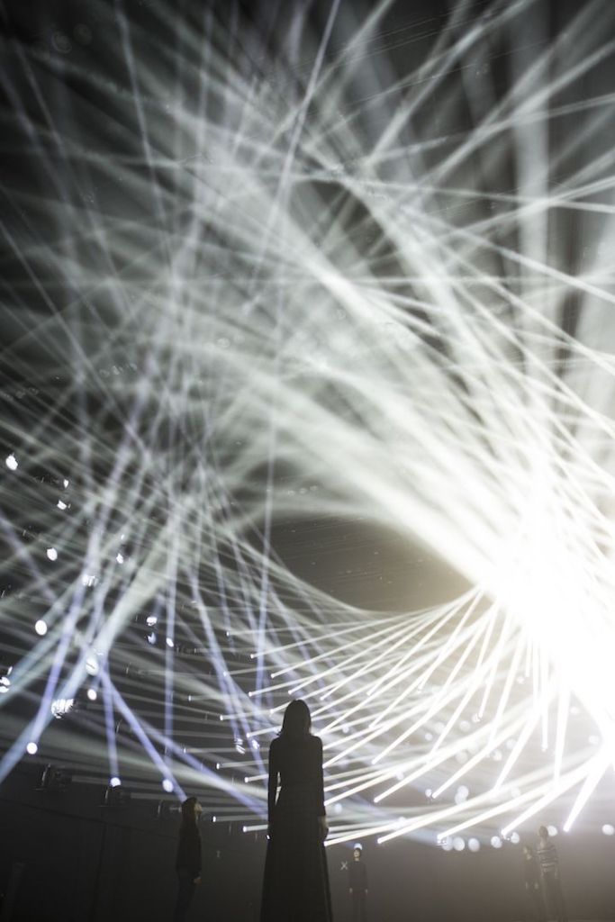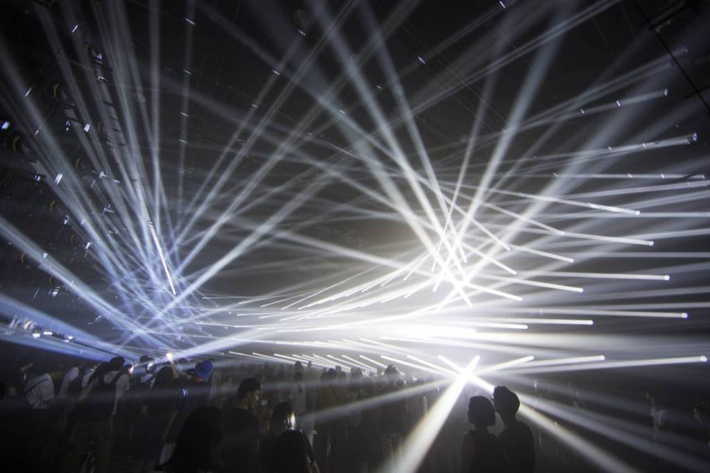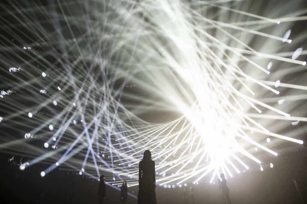 “Light Sculpture – Line series. When the lines of light converge space is reconstructed into a three dimensional object. Because both the space around you and the space created are made of light, your body becomes part of the experience.