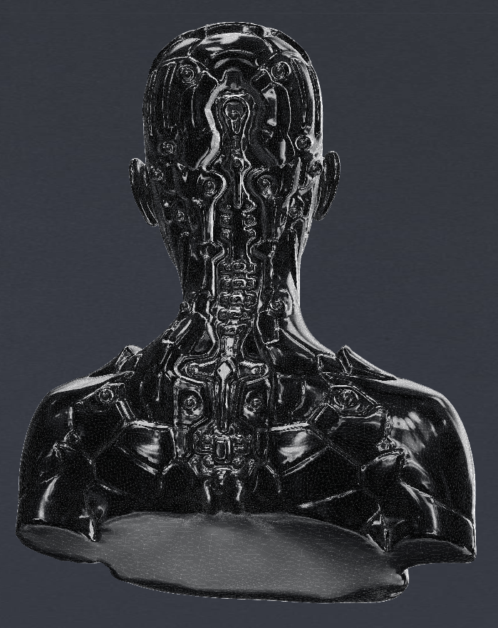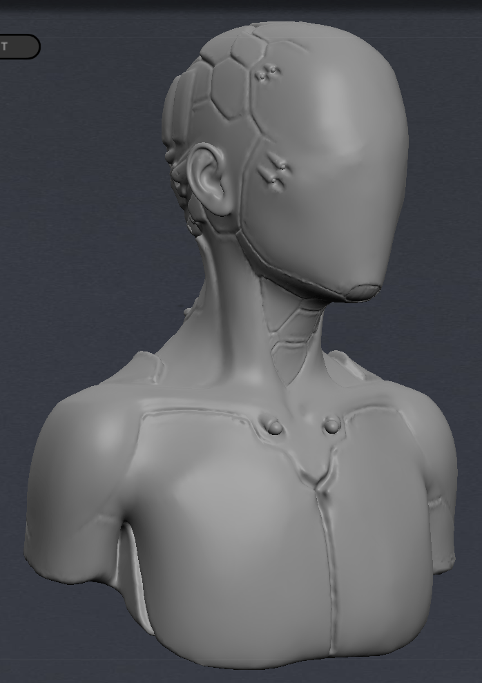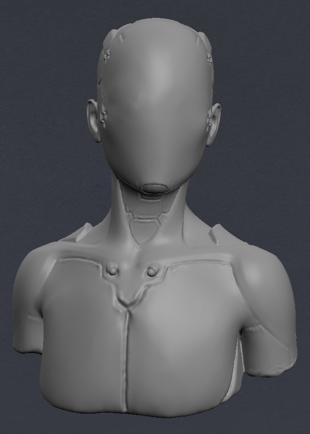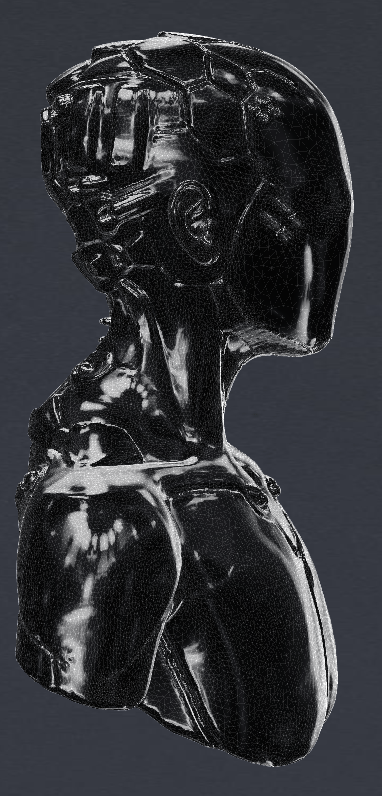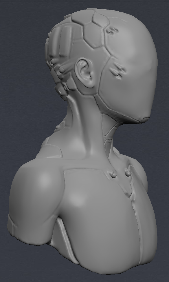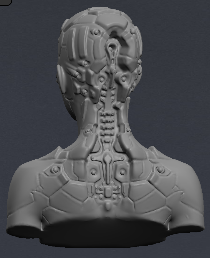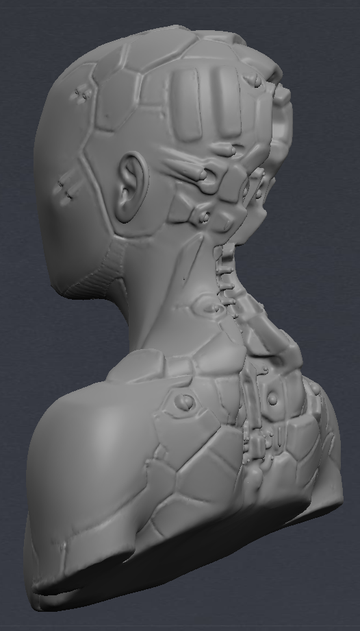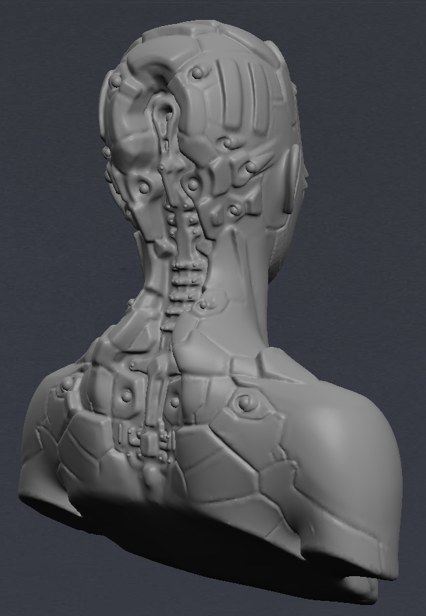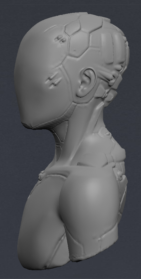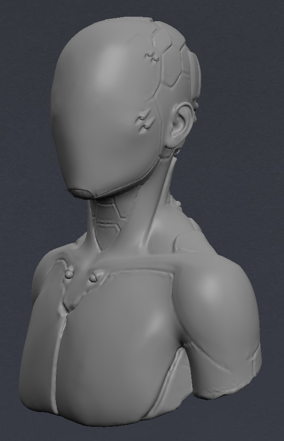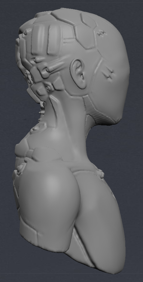 After drawing out a brief deign, I opened up Blender and MeshLab and between the two sculpted a figure than wasn’t exclusively male or female and added robotic futuristic elements. I then coloured it a dark metallic colour and set the face layer to clear so that I could import my brain models into it and animate them inside to be visible.