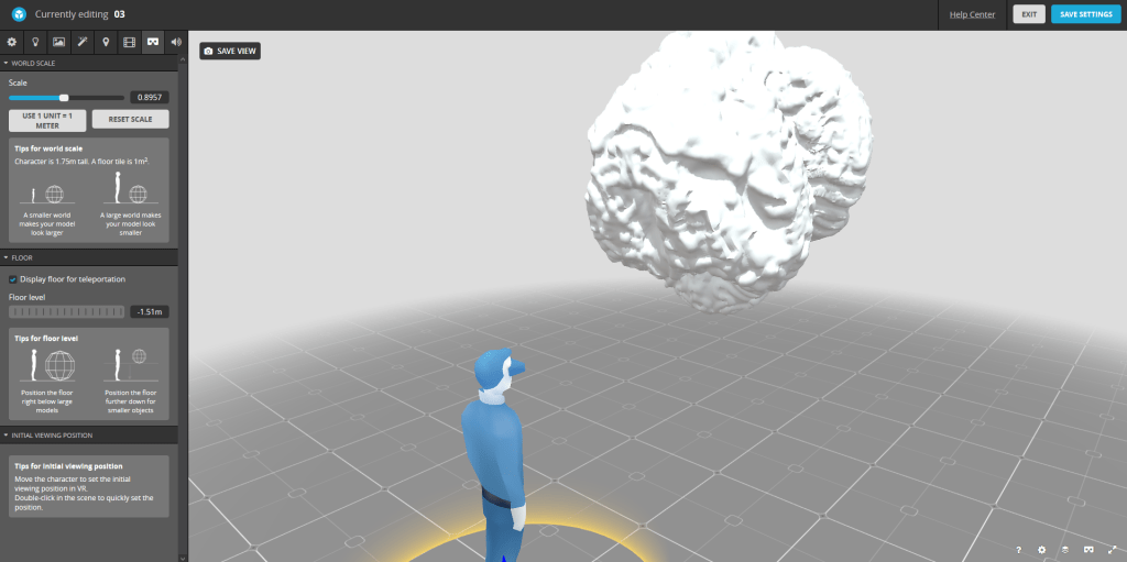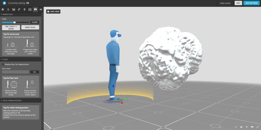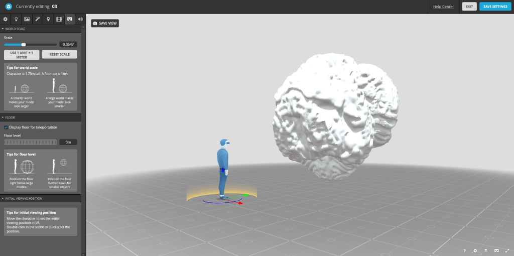 Here is how the settings are laid out. The human represents the person viweing the object and the object itself appears as it will in AR or VR. From here I can change how it will appear on the given digital plane which will map into a real space.