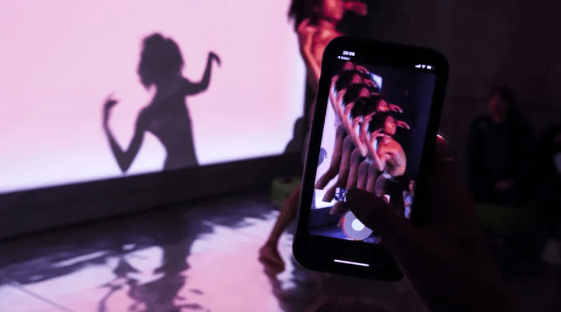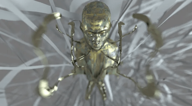 The group has also worked extensively with face filters hosted on Instagram, with the latest iteration being the Pando filter that was used during its performance in collaboration with dancer Sakeema Crook. In the performance, where the face filter is flipped and pointed at Sakeema, this merging of the physical and digital become extremely clear. Although Sakeema’s performance is intensely fluid and visceral in its own right (when viewed through our meat eyes), the filter multiplies the dancer’s body, leaving a trail of digital ghosts that is only visible through the filter. When the dancer gets close enough to your camera, the filter dons a shifting, semi-organic crown on Sakeema’s head, creating a real-life representation of the character she plays in the film.