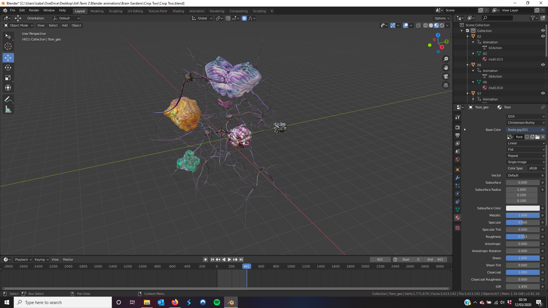 I divided my brains up into groups, wanting to do so in a way that used ones which contrasted with each other as I found that to be personally visually interesting. I wanted them to all move together in a very fluid way but also independently. I also experimented with a ‘heart-beat’ like motion that involved using the scaling animation option to make the object pulsate as if receiving nutrients and signals from the attached roots. Other animations I used were ‘orbiting’ like ones where brains orbit each other and created different movement paths, along with this spinning and slow movements. My reasons for this variety is that I wanted to give the garden a sense of cohesion but also one of individualism, with each brain it’s own entity and not just a sum of it’s parts.