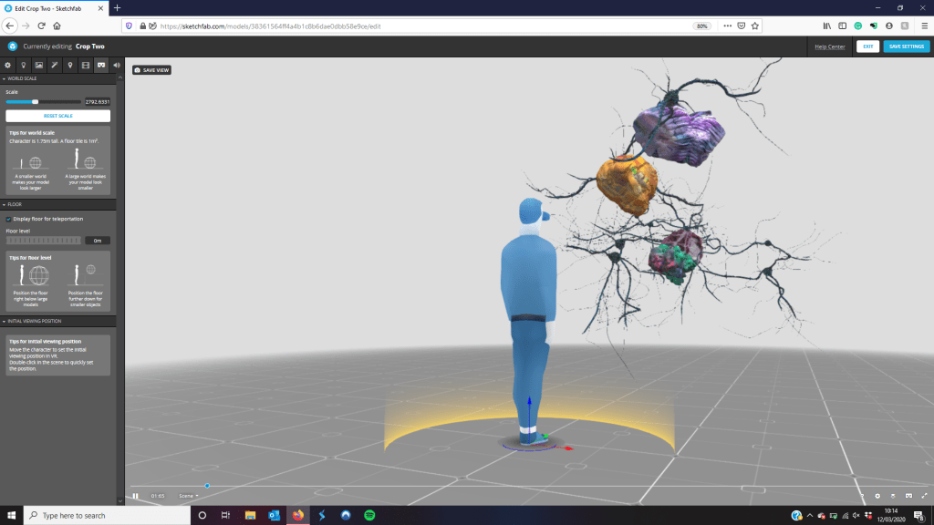 After making three models I uploaded them to SketchFab which allowed me to check they were running properly (sometimes animations and textures don’t load, especially with larger files as more problems can occur). I did struggle to get them all to load in correctly but after a few try’s each of them worked and I was able to view them on both my computer and ipad. Adjusting the AR/VR setting I was able to make them larger so that when accessed they would create a more imposing impression and seem tree like. When small the animated model is more like a brain plant, scale gives it more of a presence and walking around inside it is the interactive element I’ve been looking for during my creative process.