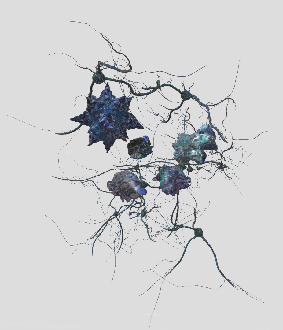 I created a model that was inspired by the natural formation of tree roots and plants but used a wire texture so that the roots of the garden look part man-made and part natural. My intentions were to blend the two as the hypothetical basis of my project is about the use of cell growth in A.I, a combination of naturally occurring acts and human interference and manipulation. I also liked the aesthetic of hanging fruit like grapes on a stalk and envisioned something similar for my brain garden.