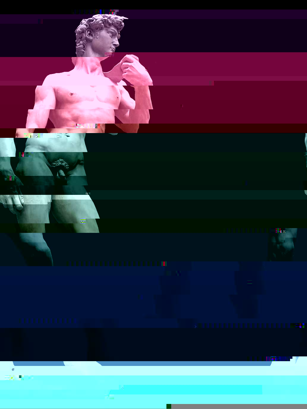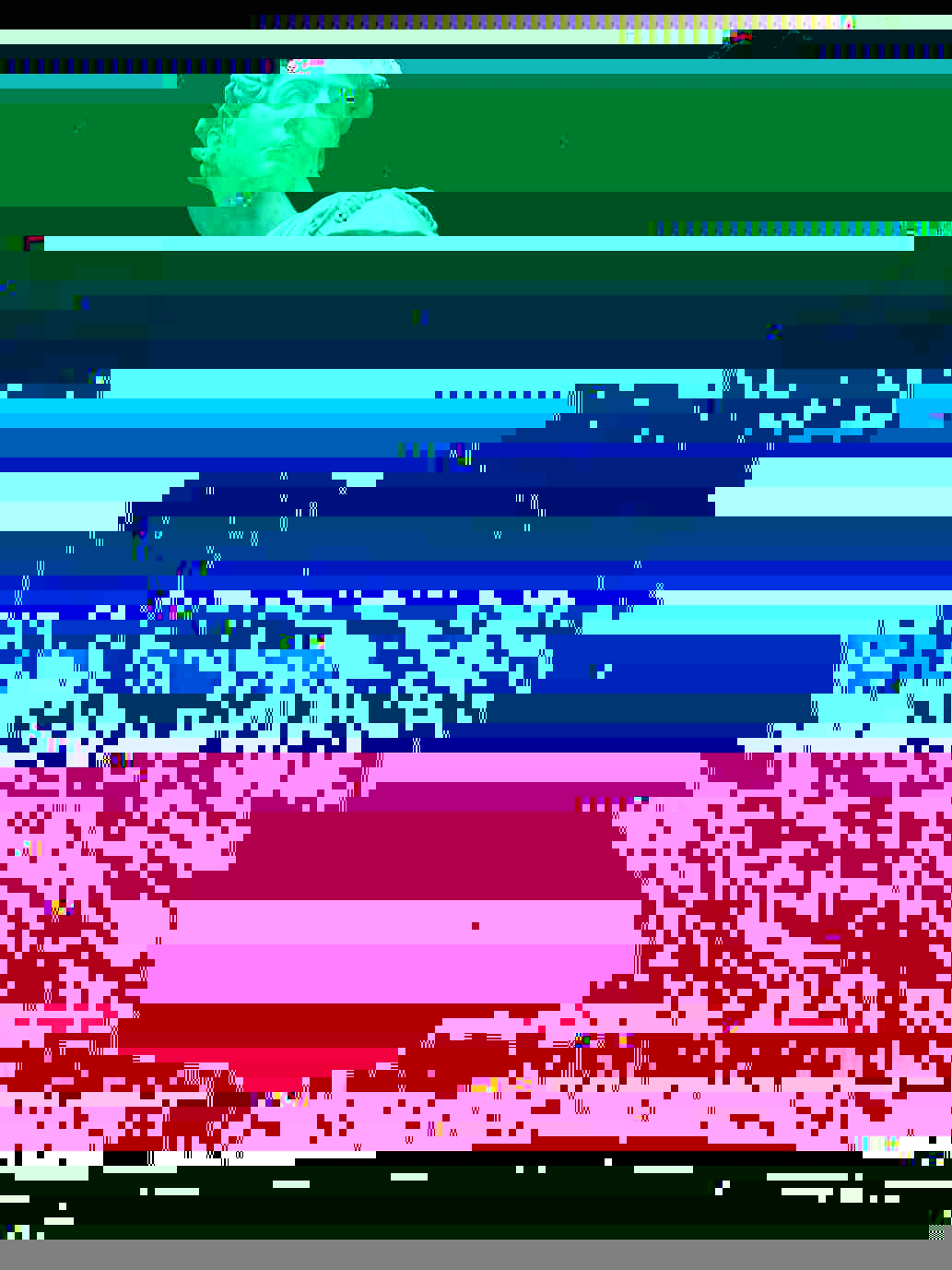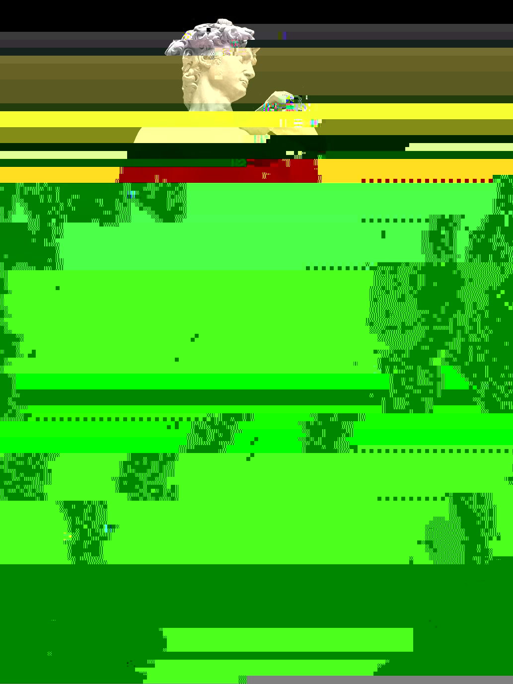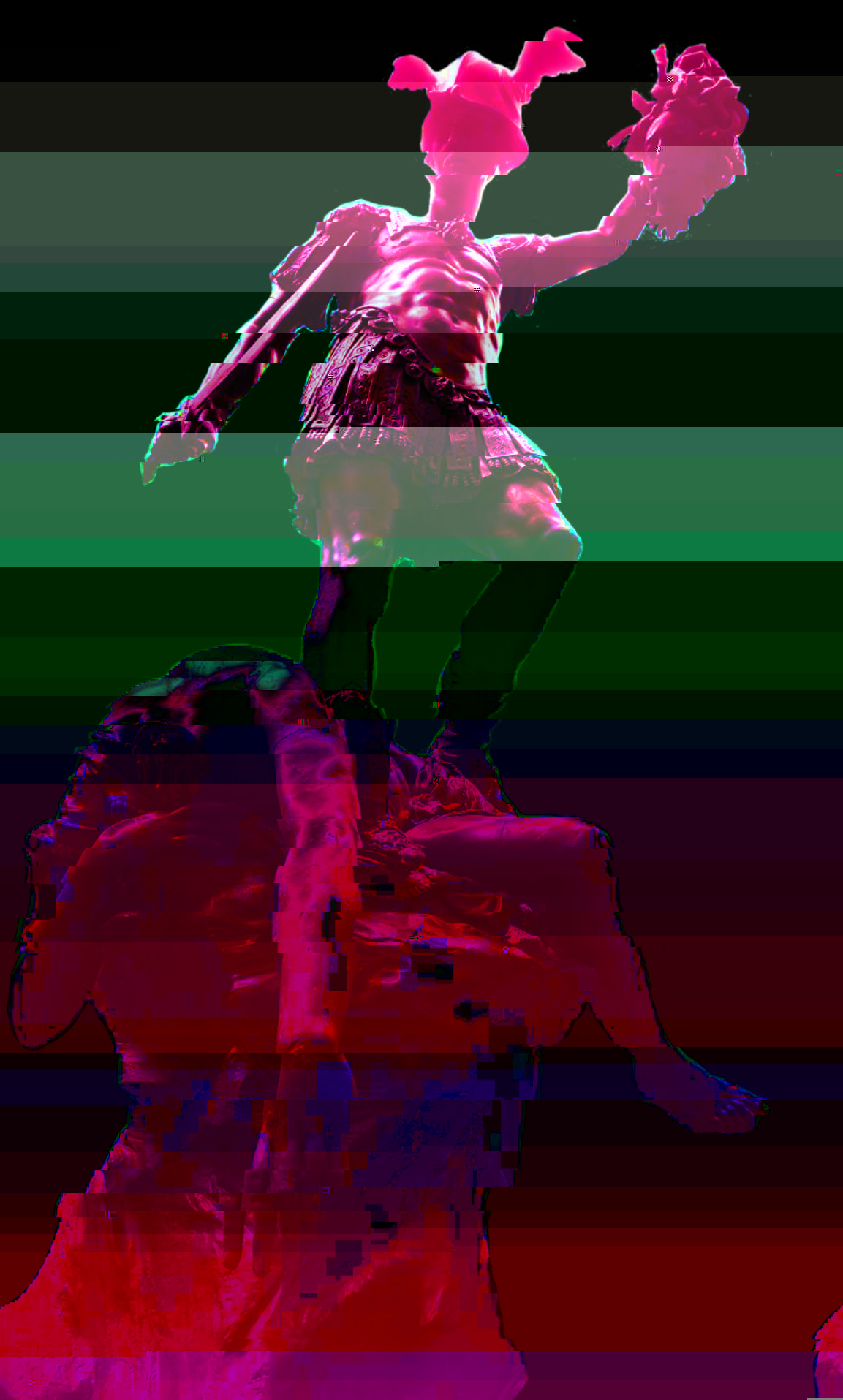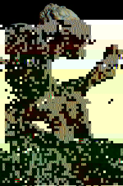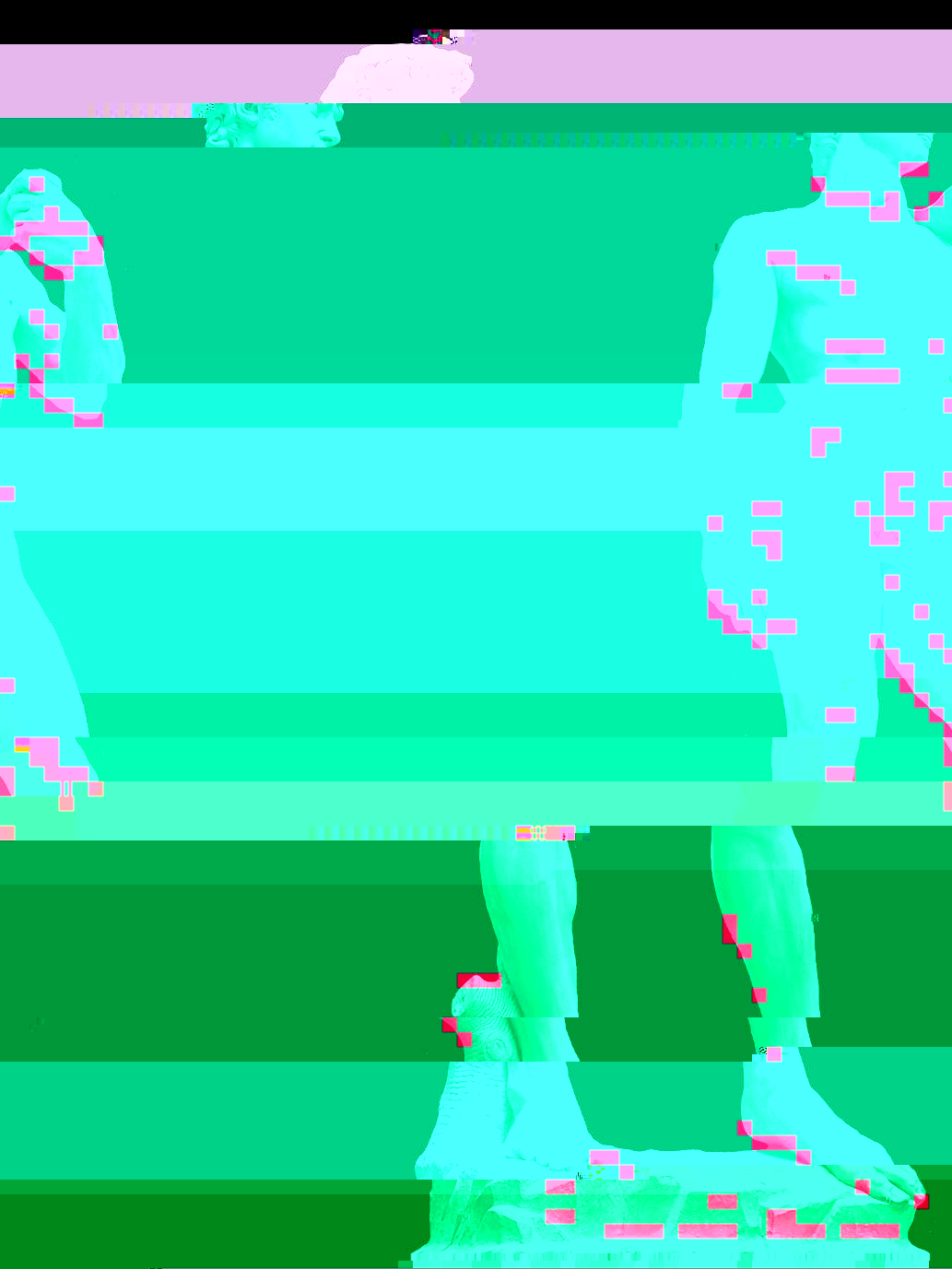 A short GIF made in Photoshop meant to utilize the double hexed images. I like movement in my work as I find still images to be somewhat flat an uninteresting so a GIF or video is more my thing. I organized the images so that there was some method to their order and created the vague impression of the first statue leaning down or traversing diagonally. I think this will be the next step in my process as the result is much more interesting to me personally and conveys the idea of glitching or imperfection more when in this format. I also like the idea of taking something traditionally static like a statue and adding rapid movements to its image.